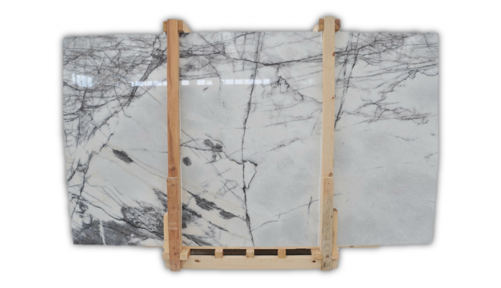 Lilac is an incredibly beautiful, elegant marble of consistent white background and lightning bolt veins of black, grey and violet. This ultra-modern slab is truly a work of art and makes a flashy, colorful statement piece, perfect for any aesthetic.